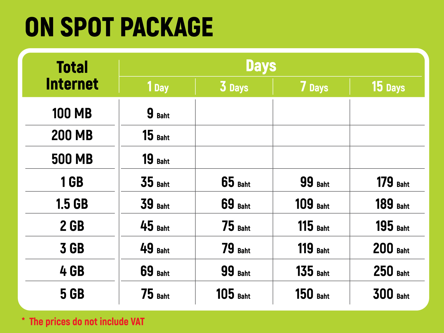 A : | After end of used “On Spot Package”, our system will calculate as ‘pay per use charge’ based on the main package rate. This charge will go to corporate’s bills. Therefore, we recommend you to check the internet usage through the number ∗121∗22# (Free of charge) or buy “On Spot Package” so you will do not need to worry about having to pay to corporate’s bills. |
