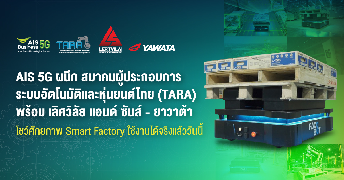 22 ธันวาคม 2564: หลังจากที่ AIS 5G Business ได้ เปิดตัวบริการและโซลูชั่นที่พร้อมให้บริการและเชื่อมต่อกับภาคอุตสาหกรรม รวมถึงโรงงานภาคการผลิต ด้วยการจับมือกับพันธมิตรที่หลากหลายทั้งภาครัฐและเอกชนเพื่อผลักดันความก้าวหน้าทางเทคโนโลยีให้มีส่วนสำคัญต่อการเสริมขีดความสามารถในทุกกระบวนการทำงาน ล่าสุดได้จับมือกับ สมาคมผู้ประกอบการระบบอัตโนมัติและหุ่นยนต์ไทย (TARA) ร่วมกันส่งเสริมการเพิ่มศักยภาพของผู้ประกอบการไทยโดยการพัฒนาโซลูชั่นบนเครือข่ายและแพลตฟอร์ม 5G ปลดล็อกขีดความสามารถภาคอุตสาหกรรมไทยให้สามารถแข่งขันกับเทคโนโลยีจากต่างประเทศ ตอบโจทย์การพัฒนา Industry 4.0 ของไทย โดยมีความสำเร็จของ บริษัทผู้ประกอบการสัญชาติไทยชั้นนำในอุตสาหกรรมอย่าง บริษัท เลิศวิลัย แอนด์ ซันส์ ผู้ให้บริการโซลูชันหุ่นยนต์และระบบอัตโนมัติสำหรับงานอุตสาหกรรม ที่ได้พัฒนาโซลูชันมาใช้งานจริงบนแพลตฟอร์ม AIS 5G Private Network แล้ววันนี้ ในโรงงานผลิตลวดเชื่อมไฟฟ้าของ บริษัท ยาวาต้า จำกัด ที่จังหวัดนครราชสีมา ซึ่งเป็นการยกระดับการทำงานภายในโรงงานสู่ Smart Factory ได้อย่างเป็นรูปธรรม โดยถือเป็นการขับเคลื่อนระบบอัตโนมัติและหุ่นยนต์เชิงพาณิชย์ ฝีมือคนไทย ที่พร้อมขยายการให้บริการและสร้างการเปลี่ยนแปลงในโลกอุตสาหกรรม เพื่อสร้างความแข็งแกร่งให้กับประเทศรองรับโอกาสและการเติบโตในอนาคต