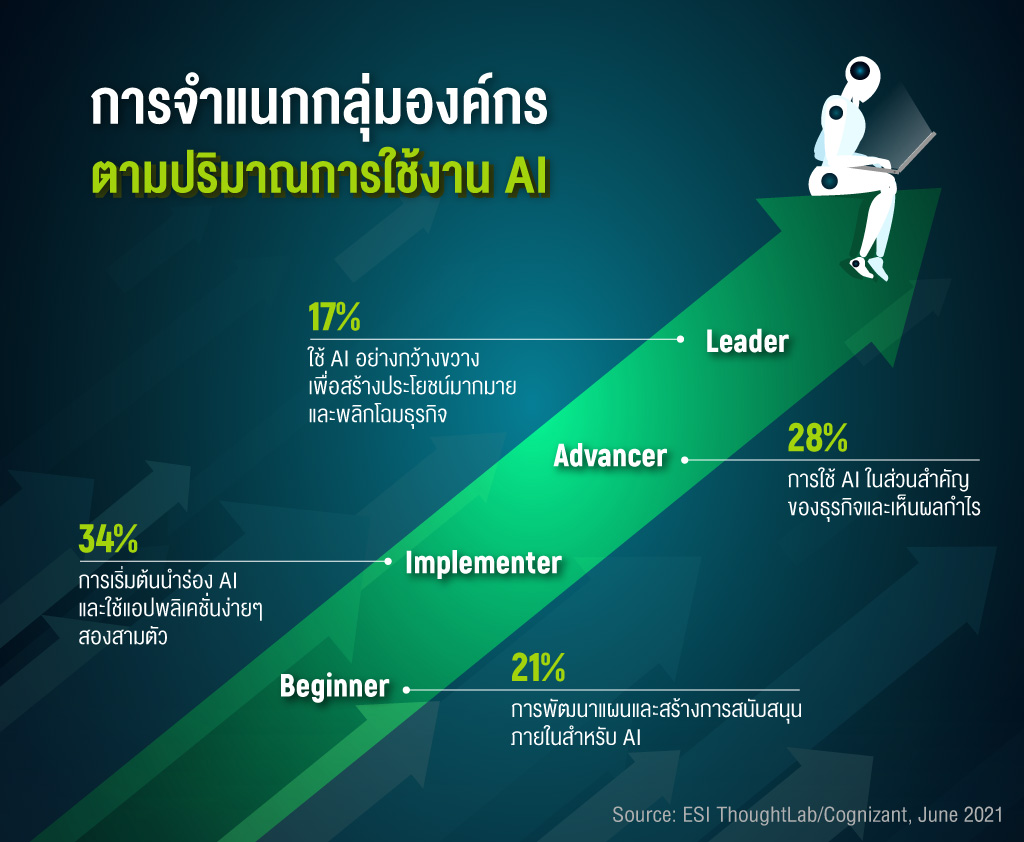 ปัญญาประดิษฐ์ (AI) กำลังเปลี่ยนแปลงอย่างรวดเร็วจากเทคโนโลยีที่น่าตื่นเต้นมาเป็นเครื่องมือสำคัญในการเอาชีวิตรอดสำหรับธุรกิจทั่วโลก ซึ่งมีการศึกษาของ ESI ThoughtLab องค์กรวิจัยด้านเศรษฐกิจการเงิน และเทคโนโลยีที่มีอิทธิพลต่อการเปลี่ยนแปลงธุรกิจ เผยข้อมูลการสำรวจผู้บริหารระดับสูง 1,200 คนทั่วโลก รวมถึงผู้บริหารมากกว่า 370 คนจากภูมิภาคเอเชียแปซิฟิก (APAC) ได้สะท้อนความเข้าใจว่า AI ถูกนำไปใช้ในโลกที่ไม่แน่นอนนี้จะมีเพิ่มมากขึ้นอย่างไร โดยผลการศึกษาชี้ให้เห็นว่าทำไมองค์กรถึงต้องจัดลำดับความสำคัญและขยายขอบเขตการประยุกต์ใช้ AIภายในอุตสาหกรรมต่างๆ ของภูมิภาคเอเชียแปซิฟิก ให้มากยิ่งขึ้น โดยผู้ตอบแบบสำรวจ 71% มองว่า AI เป็นส่วนประกอบสำคัญที่จะประสบความสำเร็จทางธุรกิจ และประมาณ 45% พิจารณาว่าตนเองอยู่ในหมวดผู้นำหรือผู้ก้าวหน้า ซึ่งชี้ให้เห็นถึงศักยภาพในการเติบโตอย่างยั่งยืนของการนำ AI มาใช้ในภูมิภาคนี้