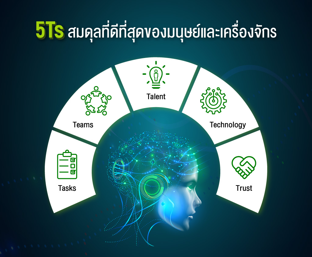 เมื่อระบบอัตโนมัติเริ่มต้นขึ้น ปฏิสัมพันธ์ระหว่างมนุษย์กับเครื่องจักรก็จะเริ่มขึ้นเช่นกัน ธุรกิจต่าง ๆ โดยเฉพาะอย่างยิ่งในอุตสาหกรรมดั้งเดิม จำเป็นต้องเตรียมพร้อมที่จะสร้างสมดุลระหว่างสองสิ่งนี้ การบูรณาการเครื่องจักรเข้ากับกระบวนการที่มีอยู่นั้น ผู้นำจะต้องเข้าใจว่างานจะได้รับผลกระทบอย่างไร ลักษณะจะเป็นอย่างไร และจะสนับสนุนการเปลี่ยนแปลงอย่างไร โดย 84% ของผู้นำ AI ในเอเชียแปซิฟิก มุ่งเน้นที่การใช้งานที่ไม่ใช่เพียงแค่ข้อมูลวิทยาศาสตร์โดยตรง แต่เป็นการใช้ AI ในการสร้างทักษะให้กับพนักงาน ทั้งการพัฒนาความรู้ในแผนกต่าง ๆ การคัดเลือกพนักงานจากการวิเคราะห์พฤติกรรม ตลอดจนการเพิ่ม AI เข้าไปในเครื่องจักรเพื่อการขนส่งภายนอกและภายในพื้นที่การทำงาน เพื่อให้องค์กรมีความพร้อมในการใช้งาน AI ที่มีความก้าวหน้ามากขึ้น ซึ่งเป็นองค์ประกอบที่จำเป็นสำหรับธุรกิจที่ต้องการจะชนะในอนาคต ด้วยเหตุนี้ เราเชื่อว่าธุรกิจต่าง ๆ สามารถมุ่งเน้นไปที่การพัฒนา 5Ts (Tasks, Teams, Talent, Technology และ Trust) ซึ่งเป็นองค์ประกอบหลักของปฏิสัมพันธ์ระหว่างมนุษย์และเครื่องจักร ได้แก่ งาน ทีม ความสามารถพิเศษ เทคโนโลยี และความไว้วางใจ
