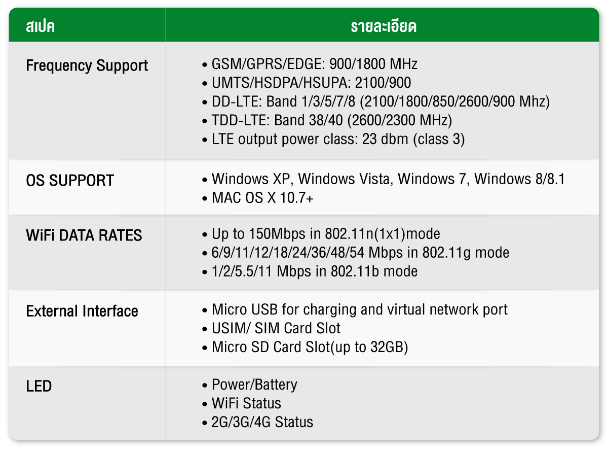 - รองรับ 4G/LTE FDD 2100/1800/850/2600/900 Mhz